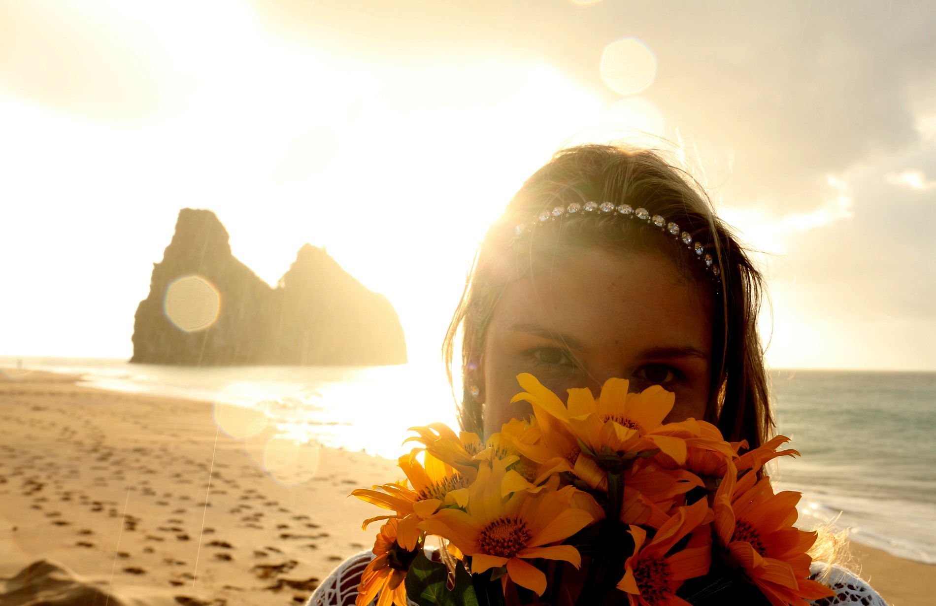 O ensaio fotográfico em Fernando de Noronha é realizado em uma das deslumbrantes praias da ilha, com cenários que são verdadeiros cartões-postais, incluindo uma vista incrível para o pôr do sol.